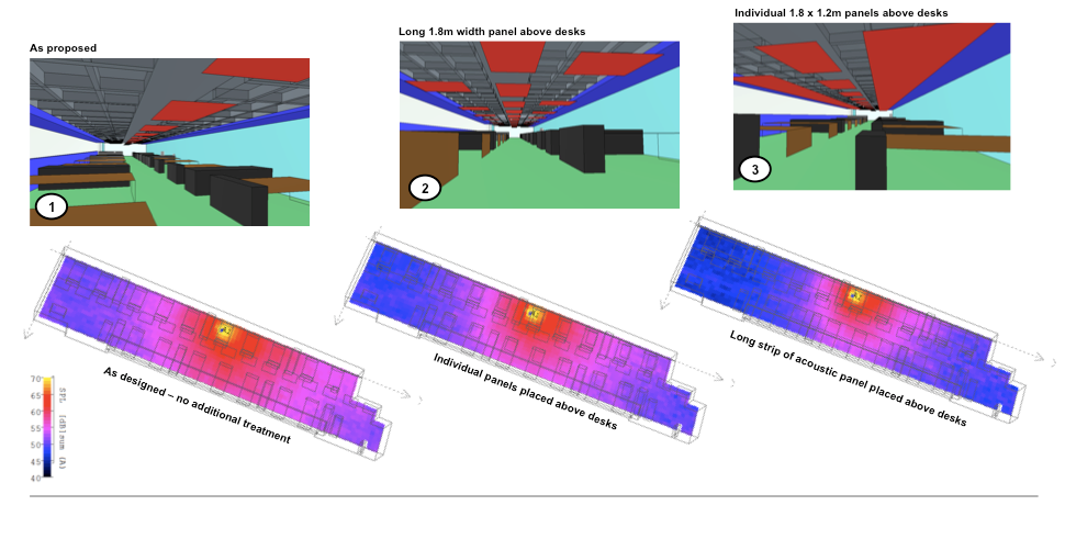 A multitude of CATT Acoustics models were created to assess several factors. Firstly effective was the addition of acoustic treatment in the form of suspended rafts above the walkway between desks and later above desks, Whilst the absorption coefficient of these are similar to BCO traditional guidance, the quantities of panels are vastly reduced by specifically placing them in the most effective areas over desks and cabinets/shelves to reduce noise transfer (Figure 1).
