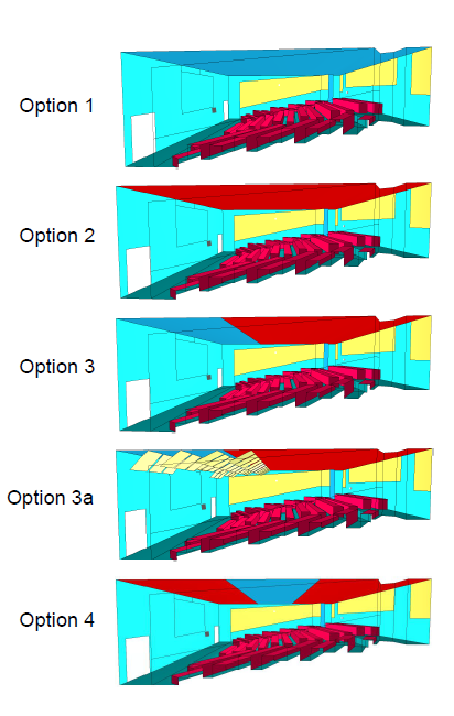 The results show that levels in the wider areas, even when at a comparable distance to a position in the centre of the room are significantly lower. Levels at the back of the room are very similar to those as wide seating positions in the first few rows. This occurs mainly for two reasons.