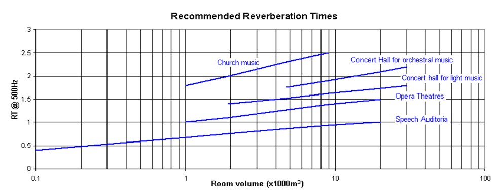 The equation below provides the basic Sabines formula for reverberation. From this equation, it can be seen that to achieve variable levels of reverberation, either the volume of the auditorium and/or the levels of soft treatment within the auditorium, needs to be adjusted.